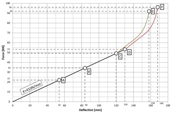 In the case of the vehicle in question, the leaf springs have a stiffness of Kr = 410 N/mm. In the event of asymmetric loading of the leaf springs, they are supported by two stabilizers of different stiffness. The first axle stabilizer has a torsional stiffness of K1 = 126.8 kN/mm, while the torsional stiffness of the second axle stabilizer is K2 = 100.7 kN/mm. The characteristic operating points of the suspension are shown in Figure 2. Point A is the static spring load of axle I. Point B is the static load on the axle spring of axle II. Points C and D are the leaf spring-to-buffer contact moment. Points E and F represent the maximum deflection of the leaf spring.