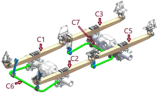 - The first: C1 and C2 of the pair of leaf springs, C6 of the stabilizer between the springs;