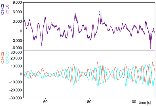 The preliminary analysis of the recorded waveforms used the values after conversion. They were then processed according to relation 13 and 14. The waveforms were compared to the example waveform (Figure 6): the waveforms of the difference of values after conversion in the measuring paths C1 and C2 on the springs with the doubled value after the conversion of C6 on the stabilizer between the pair of springs of the first axle almost coincided. The small discrepancies in the signals may be due to the not fully accurate kinematic relationship between the displacement of the springs and the angle of twist of the stabilizer in the suspension mechanism. An analogous situation occurred in the case of the second axle. The waveforms of the difference of values after the conversion of C3–C5 almost coincided with the waveform of the doubled value after the conversion of C7.
