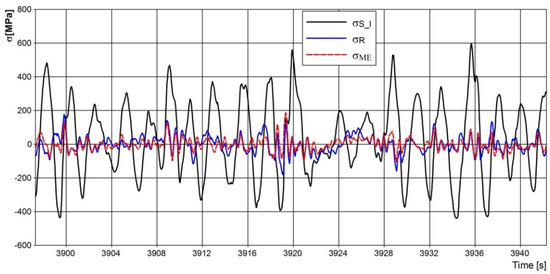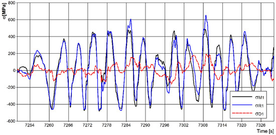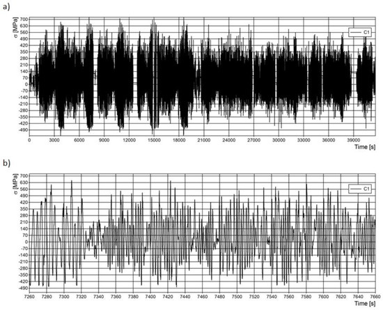 The measurements were taken over the distance of approximately 10,000 km in the autumn. During the tests, the vehicle was loaded to its maximum total mass (32,000 kg). It was driven on asphalted and dirt roads with a hard surface and on unpaved roads with an often deteriorated surface and bumpy ground. The average daily mileage of the vehicle on asphalt roads was about 500 km, while on dirt roads, it was about 120 km. During the tests, the vehicle was driven at a speed that allowed safe driving in off-road conditions. The maximum speed was about 25 km/h. The measurement data received were used to obtain strain waveforms, from which the stress waveforms in the measurement directions were determined. The measurement results obtained in the test section during one measurement day are presented below. Example stress curves measured at point C1 are shown in Figure 7.