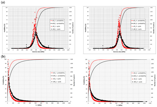 The determination of symmetrical stresses and provides information on the average stress of axles I and II springs. On the other hand, unsymmetrical stresses σD1 and provide information on the stress difference between the left and right sides of the car. The data thus obtained give information on the operation of the stabilizer. From such data, it is possible to determine whether the springs worked evenly during the car’s life and what effect the stabilizer will have on the life of the spring. Figure 8a shows the developed distributions of the symmetric and asymmetric stress waveforms together with the number of occurrences of extreme stress values and the number of occurrences of the stress ranges (Figure 8b).