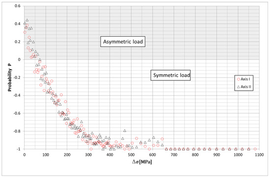 Comparison of probabilities of the occurrence of cases with corresponding stress ranges for both axes for symmetric and asymmetric examples.