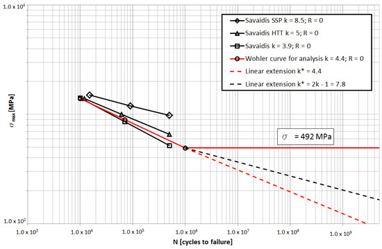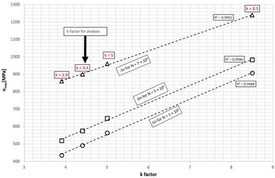 The relation between different values of the k-factor (Equation (12)) for the same cycle asymmetry factor R was analyzed. Data for the same steel grade were taken into account. Figure 12 shows the way the value of the maximum stress σmax changes for different factors k in a similar number of cycles N. By running a straight line through the points obtained, a linear relationship between the stress range and the k factor for different numbers of cycles can be observed. The fatigue limit, defined as the knee point on the Wohler curve was taken to Nk = 1 × 106 cycles [9]. Below the knee point, the k-factor was checked for k* = k and for k* = 2k − 1 [25].