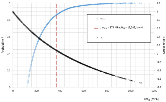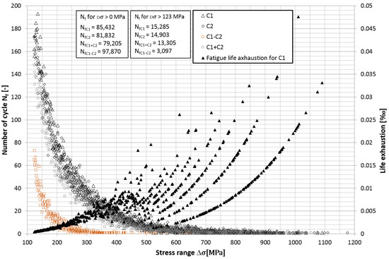 The equivalent value of the stress ranges is always assigned to the number of cycles for specific stress value level. Using the Wöhler curve factor , the equivalent value can be recalculated for the other cycle numbers. Cycle numbers can also be calculated by changing the level of the equivalent value of a stress range so that comparisons of cycle numbers are possible. An example of the location of the equivalent value for point C1 is shown in Figure 14. The change of the R value for the given stress ranges was also specified. To determine this value, it was assumed that the mean value of the stress in the leaf spring is constant, as the measurements were carried out on a vehicle with constant mass throughout the tests. Eventually, the truck was expected to run with a constant load.