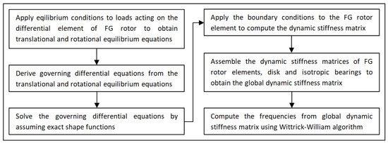 The step-by-step methodology followed in the present study to develop the DSM formulation for the FG rotor and to conduct the free vibration analysis of the FG rotor bearing system is shown in Figure 2 in the form of a flow chart.To begin with, the expressions for various loads acting on the differential element of the FG rotor at the deformed equilibrium state have been considered, and the governing differential equations of motion for the FG rotor element have been derived by applying the conditions of equilibrium. The exact shape functions have been assumed to obtain the exact solution for the governing differential equations, and the dynamic stiffness matrix has been developed for the FG rotor element. The dynamic stiffness matrices of the FG rotor system, such as rotor, disc and bearings are assembled together to obtain the global dynamic stiffness matrix of the FG rotor bearing system. The Wittrick–William algorithm has been employed as a root searching technique to compute the natural and whirl frequencies from the global dynamic stiffness matrix.