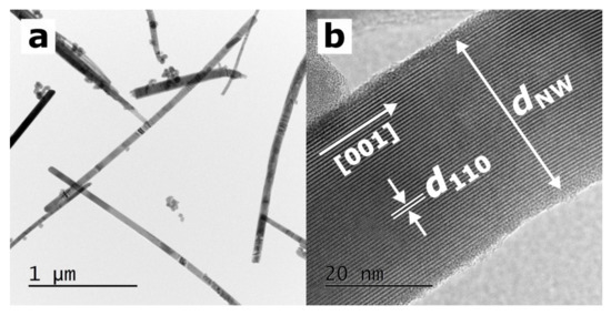 (a) TEM micrograph presenting a dozen SbSI nanowires and (b) HRTEM image of a selected SbSI nanowire. The white arrows indicate the [001] polar direction, nanowire thickness (dNW = 33.6(16) nm), and interplanar spacing (d110 = 0.6517(20) nm), which corresponds to the interplanar spacing of (110) planes reported in the literature for SbSI [35].