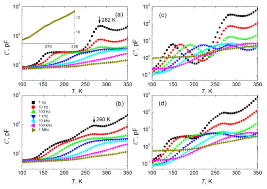All the above remarks regarding the temperature dependences of the real part of the capacitance (Figure 4a,b) also apply to the imaginary part of the capacitance (Figure 4c,d), respectively. As typically for losses, both anomalies are displayed as bell-shaped curves. Unluckily, these textbook profiles appear partially spoiled at higher temperatures by the enhanced electrical conductivity of the investigated sample.