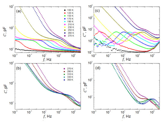 Spectra of the losses, as represented in Figure 5c,d by the imaginary part of the capacitance , can be discussed in an analogical way. However, in this case, one observes typical bell-shaped curves gradually shifting towards higher frequencies when temperature increases.