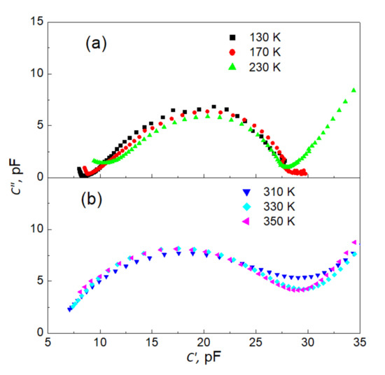 Additional information on the character of the investigated relaxation can be extracted from dispersion curves plotted on the complex plane (Figure 6a,b). In Figure 6, only representative curves for ferroelectric (Figure 6a) and paraelectric (Figure 6b) phases are shown.