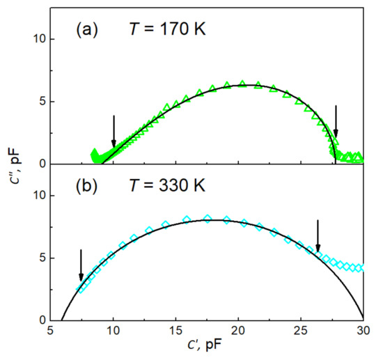 All the fits were carried out on the complex plane; thus, the real and imaginary capacitance data were exploited simultaneously. This approach ensures higher reliability of the fitting procedure rather than fitting real and imaginary parts of capacitance separately. The peculiarities of the fits are illustrated in Figure 7a,b, where typical examples for both types of dependences are demonstrated. The solid line in Figure 7a represents the best fit of Equation (5). The fitting parameters pF, pF, ms, and are for the data measured at 170 K. The fitting was carried out within the data range marked by vertical arrows, and next the line was extrapolated outside the fitting range to draw an entire dependence. As seen in Figure 7a, the quality of the fit is highly satisfactory within experimental uncertainties. Similarly, the solid line in Figure 7b represents the best fit of Equation (6) with fitting parameters pF, pF, ms and for the data measured at 330 K. An almost perfect fit is reached again.