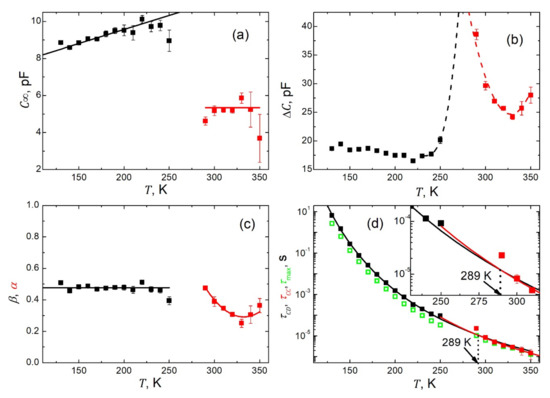 Temperature dependences of the fitting parameters from the best fits of the vs. data to Equations (5) and (6), respectively. (a) High frequency limit of the capacitance . The solid lines are to guide the eyes. (b) Relaxation strength . The dashed lines anticipate possible dependences around the phase transition point. (c) Shape parameters β (black squares) and (red squares). The solid lines are to guide the eyes. (d) Cole–Davidson and Cole–Cole relaxation times (black and red squares respectively). The solid lines represent the best fit to Arrhenius law with s and eV for the black curve, and s and eV for the red one. For comparison, the