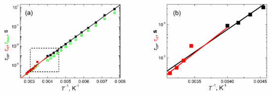 Arrhenius-type presentation of the relaxation times shown in Figure 8d. (b) Data replotted from the area marked with a rectangle in (a) to visualize the intersection of the fitting lines.
