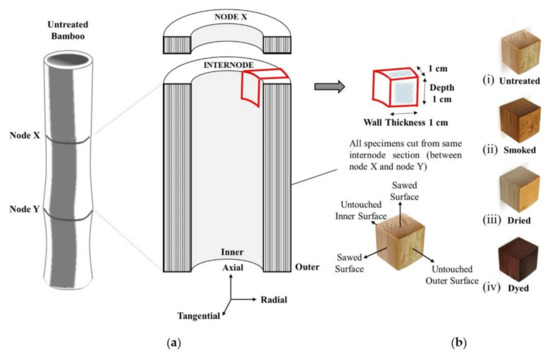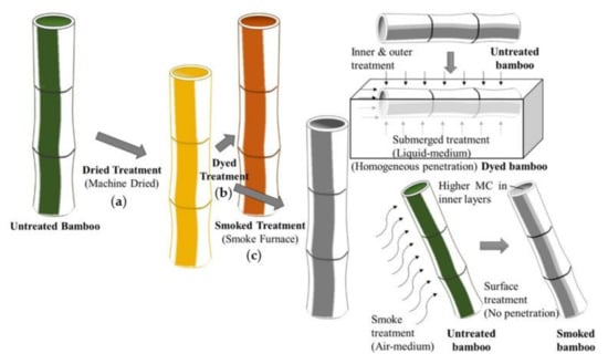 For the purpose of comparing the characteristics of smoke-modified bamboo, another two types of treatment-modified samples, namely dried and dyed, which differed in treatment methodologies, were considered. To minimize the incidence of cracking, dried bamboo is generally prepared from harvested bamboo by natural drying in forest in the first two months following harvest and an additional 12-month inside in factory environment. In this study however, since all specimens were prepared from the same culm, the dried samples were prepared from natural bamboo by kiln oven drying method followed by a heat treatment to remove oil from its hard, waxy outer surface. Dyed specimens were obtained by subjecting dried bamboo to a submerged chemical-bath treatment consisting of colored pigments (Dianix blue E-GR and Miketon polyester yellow, DyStar, Osaka, Japan). In this study, natural bamboo specimens, prepared from untreated Madake Bamboo, were used as control. The schematic illustration of treatment methodologies used to prepare various bamboo samples are outlined in Figure 2.