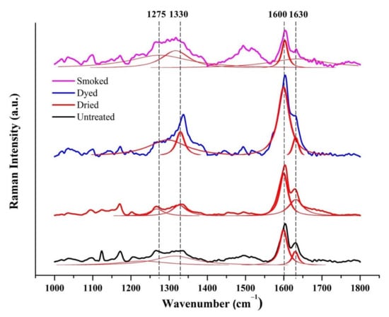 The Raman spectra, which differed due to the different chemical changes in bamboo as a result of treatment modification, were further analyzed by considering the ratio of normalized peaks. From Table 1, peak intensities at 1600 cm−1 and 1632 cm−1, which have been attributed to lignin component in bamboo [8,18,19], with respect to normalized peak intensity of 1173 cm−1 gives an accurate indication of the relative changes among modified bamboo specimens. The lignin-specific peaks of varying intensities could be considered to reveal the pronounced differences which prevail in various bamboo specimens as a result of treatment modification. In this context, the Raman band ratio (I1600/I1173) was used as an indicator to assess the relative change of treatment modification with respect to untreated bamboo. In untreated and dried bamboo, the peaks at 1600 cm−1, which corresponds to strong aryl ring stretching of lignin in cell corner of bamboo fibers, was two-fold greater than the second of the doublet peak at 1632 cm−1 [18]. Besides, the doublet peak at 1600 cm−1 and 1632 cm−1 also gives an indication of the presence of ferulic and p-coumaric acids in bamboo cell walls [5,8,13,18]. Both I1600/I1173 and I1632/I1173 ratios clearly show a decreasing trend in peak intensities of smoked bamboo in comparison to the untreated and dried ones. The notable increase in both peaks in dyed bamboo is attributed to the specific changes caused by the chemical compound present in the chemical dye.