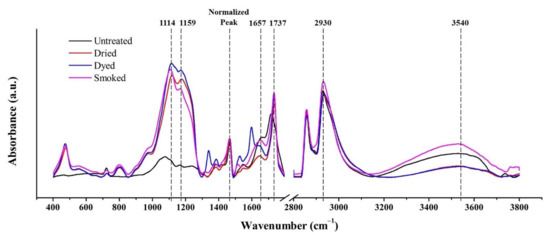 In the spectral range of 2800–3800 cm−1, the two peaks observed at 2930 cm−1 and at 3540 cm−1 were assigned to C-H and O-H functional groups respectively. The increase in peak of smoked specimen relative to untreated bamboo at 3540 cm−1, occurred as a result of the nature of smoked treatment which was composed of a mixture of steam and combustion smoke of organic matter [22,25].