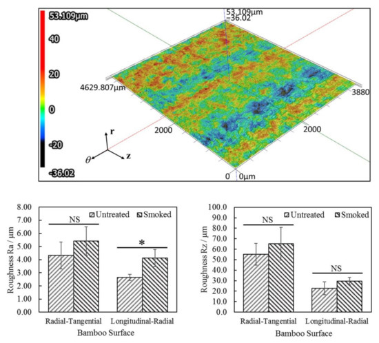 Figure 7a shows the 3D map with a height magnification of 100% which has been processed for surface shape correction by wave form removal prior to roughness analysis. Roughness analysis of the radial-tangential and longitudinal-radial surfaces of untreated and smoked bamboo was conducted by considering the mean roughness parameter Ra and the average maximum peak to depth parameter Rz. The parameters Ra and Rz were obtained by the multi-line roughness analysis method based on the data collected from five locations in each sample via the laser profilometry technique. The results of roughness analysis on bamboo specimens are displayed in Figure 7b,c. From roughness analysis of Figure 7a, the difference observed in the mean roughness parameter Ra prevailing between the longitudinal-radial surface of untreated and smoked bamboo was found to be statistically significant (p > 0.05). In contrast, no statistically significant difference was observed in the mean roughness parameter Ra involving radial-tangential surfaces since both surfaces were manually sawed ones. In terms of the average maximum peak to depth parameter Rz, no statistically significant differences were observed between the radial-tangential surfaces and between the longitudinal-radial surfaces of untreated and smoked bamboo.