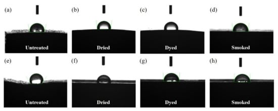 Contact angle measurements taken from (a–d) the outer and (e–h) inner sections of untreated and modified bamboo specimens by the Phoenix 300 contact-angle system; the contact angle was calculated by using the Imagej software.