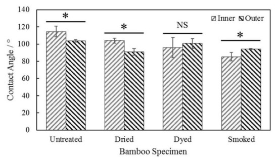 Water contact angle measurements on the inner and outer longitudinal tangential surfaces of untreated and modified bamboo specimens (* statistically significant difference, NS = no significant difference).