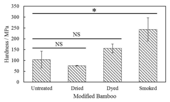 The hardness of bamboo specimens, measured from the longitudinal-radial section, was found to range between 75 and 250 MPa as indicated on the bar chart of Figure 10. Among the measured specimens, the hardness in smoked bamboo was found to be two-fold higher as compared to the untreated ones. The increase in hardness is attributed due to change in chemical structure resulting from treatment modification.