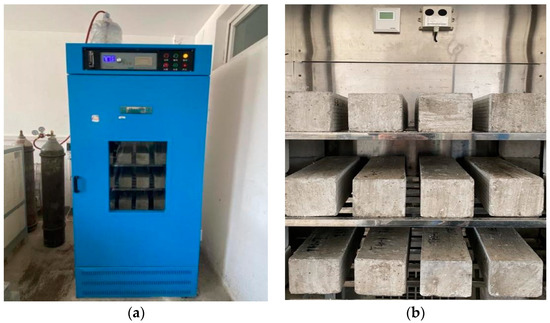 According to the Chinese standard GB/T 50082-2009 [19], the concrete moulding is 100 mm × 100 mm × 400 mm prisms, and three test pieces are made for each mix proportion for the determination of carbonation depth by the phenolphthalein solution method and the determination of the pH value of the apparent pore solution, MIP, and SEM. After the specimen is formed for 24 h, the mould is removed, and the specimen is placed in a standard curing room for curing. After curing for 26 d, the specimen is placed in a 60 °C oven and dried for 48 h. After removing it, apart from leaving two opposite nonformed sides, the other surfaces are sealed with heated paraffin. The specimens are then placed into a carbonation test chamber (Figure 1) at a temperature of 20 ± 2 °C, humidity of 70 ± 5%, and CO2 concentration of 20 ± 3% to accelerate carbonation to 7, 14, 28, and 56 d. The specimens are taken out and sampled by the splitting method (Figure 2).