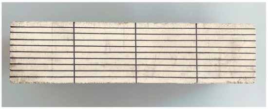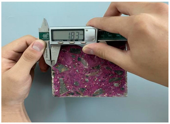 When carbonation reaches 7, 14, 28, and 56 d, the test pieces of each proportion are removed, the shape is broken from one end by the splitting method, the powder is scraped off on the cut section, and then the phenolphthalein indicator is sprayed at a concentration of 1%. The depth of the complete carbonation zone can be determined according to the colour change of the indicator. After 30 s, the carbonation depth of each measuring point is measured using a digital Vernier calliper, and the arithmetic average of each measuring point is considered as the carbonation depth of the test piece (as illustrated in Figure 3). The cutting surface of the remaining specimen is sealed with paraffin and then placed into a carbonation box to continue carbonation until the next test age.