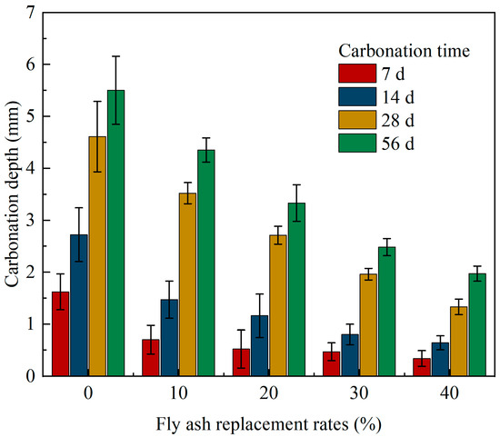 The change in the carbonation depth of concrete with different fly ash replacement rates under each carbonation age is shown in Figure 5. It can be observed from Figure 5 that the carbonation depth of each specimen gradually increased with the increase in carbonation time. However, the carbonation rate of concrete decreases obviously in the last stage of carbonation, as illustrated in Table 4, when carbonised to 56 days. The carbonation rates of CFA with replacement rates of 0%, 10%, 20%, 30%, and 40% are 0.09, 0.08, 0.06, 0.04, and 0.04 mm/d, which are only 0.39, 0.80, 0.86, 0.57, and 0.80 times the carbonation rate of 7 days, respectively. This is similar to the previous concrete carbonation test results and theoretical results. The reason for this phenomenon is that the CO2 concentration gradient decreases with an increase in the carbonation depth; however, CaCO3 generated in the carbonation process fills part of the pores of concrete, making the concrete structure denser, thus reducing the air permeability of concrete and hindering the further diffusion of CO2, which reduces the carbonation rate [29,30,31].