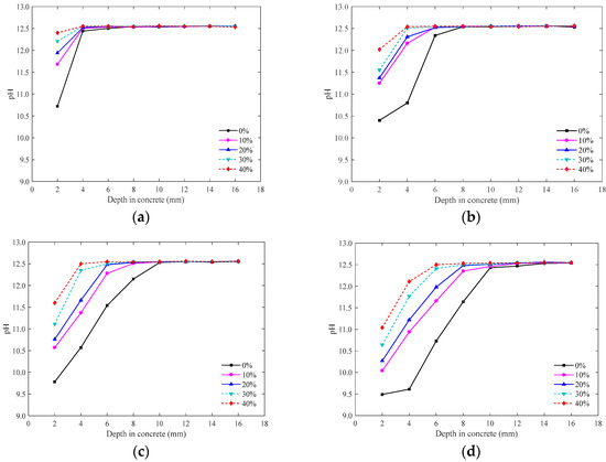pH value of CFA after carbonation. (a) Carbonation-7d, (b) carbonation-14d, (c) carbonation-28d, (d) carbonation-56d.