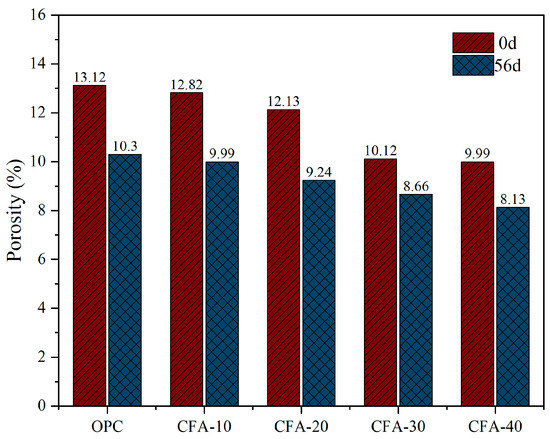 Porosity refers to the proportion of void volume to total volume, which has an important impact on the strength and durability of concrete [40]. This can characterise the influence of the fly ash substitution rate on the percentage of cement stone void per unit volume. The porosity of concrete before and after carbonation with different substitution rates of fly ash measured by mercury injection is presented in the Figure 7. Compared with ordinary concrete, the decrease in porosity of CFA10 and CFA20 before the carbonation reaction is not obvious, and the ranges are 2.29% and 7.54%, respectively. The porosities of CFA30 and CFA40 decrease by 22.86% and 23.86%, respectively. For carbonated concrete, the porosity of each group of CFA decreases with an increase in the substitution rate, ranging from 14.4% to 23.8%. The porosity of CFA40 after carbonation is the lowest (8.13%). This also indicates that the replacement of fine aggregate with fly ash can effectively reduce the porosity of concrete, which may be the insoluble product CaCO3 generated by the carbonation reaction that fills the pores and reduces the porosity [26]. In addition, owing to the microaggregate effect of fly ash under the secondary hydration of fly ash [41,42], a higher fly ash content can better fill the aggregate gap, thereby improving the compactness of concrete.