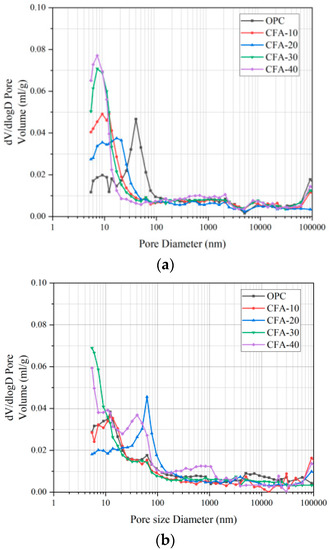 Differential logarithmic curve of mercury intake before and after carbonation of concrete under different fly ash replacement rates. (a) Carbonation-0d; (b) carbonation-56d.