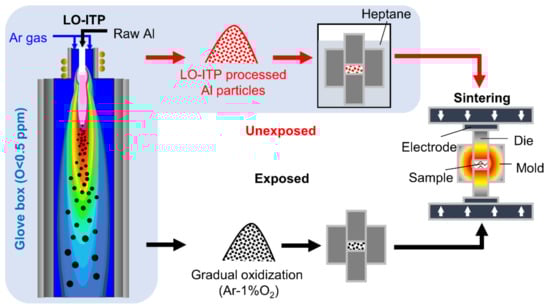 Figure 1 shows a schematic illustration of the experimental procedure. Commercial Al powder (particle size 20 μm, purity 99.99%, oxygen level 0.14 wt.%, Kojundo Chemical Lab. Co., Ltd., Saitama, Japan) was used as a raw material. The plasma was prepared by setting the radio frequency (RF) powder to 3 kW in a chamber filled with Ar gas (G1 grade, oxygen level less than 0.1 ppm) with a pressure of 70 kPa. Then, raw material was inserted into the chamber from the top of the torch by a powder feeding system (TP-99010FDR, JEOL Co., Ltd. Tokyo, Japan) at a feed rate of up to 5 g/min through the carrier gas. The Al powder processed with LO-ITP was collected from the main chambers and the Cu plates in a glove box where the oxygen content was controlled to be under 0.5 ppm. By measuring the specific surface area using the Brunauer–Emmett–Teller measurement (BET, 3 Flex Physisorption, Micrometrics Instrument Corp. Norcross, GA, USA) with nitrogen gas, the average particle size of the LO-ITP processed Al powder was calculated. The particle size distribution of the processed Al powder was estimated by field emission scanning electron microscopy (FE-SEM) (TESCAN, VEGA II LSU, Brno, Czech Republic). As a reference, we gradually oxidized the Al powder processed with LO-ITP by exposing it to 1% O2-Ar gas for 12 h (denoted as “exposed Al powder”). Conversely, the Al powder processed with LO-ITP that had not undergone gradual oxidization was called the “unexposed Al powder.”