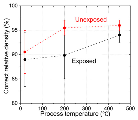 In Figure 3, the correct relative density is plotted against the process temperatures of 20 °C, 200 °C and 450 °C for unexposed and exposed Al compacts. Here, since the density of Al oxide (3.9 g/cm3) is 1.4 times higher than that of Al, the relative density was corrected by calculating the amount of oxide from the measured oxygen content of Al compacts using Equation (1), as shown in Table 1. The correct relative density of unexposed compact Al was nearly saturated at a process temperature of 200 °C. On the other hand, the correct relative density of exposed compact Al was not saturated at 450 °C.