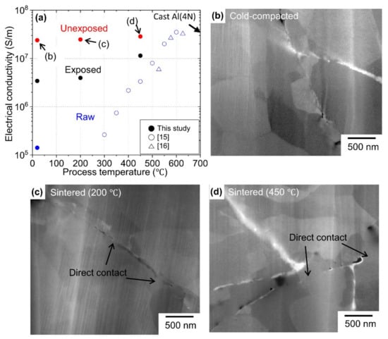 The arbitrary interface between Al powder was observed by FE-SEM in an Al compact prepared by cold compaction (Figure 4b), sintering at 200 °C (Figure 4c) and sintering at 450 °C (Figure 4d). The area where the Al particles were directly contacted is indicated by arrows in the figures. As the process temperature increased, so did the frequency of the direct contacted area. As a result, the increase in electrical resistance due to the non-direct contacted interface could be suppressed. Therefore, the conductivity could be kept high. On the other hand, when using commercially available Al particles, it is necessary to remove the oxide layer on the surface to obtain high conductivity. This requires a temperature above 550 °C [18,19]. Therefore, the oxide film of ITP-processed Al powder is thin enough to secure conduction, that is, it has a surface cleaning effect. To evaluate the oxide film effect between the grains directly, high-resolution microstructure analysis, such as TEM (JEOL Ltd. Tokyo, Japan), 3D atom probe and in-situ TEM observation at an elevated temperature [30], are effective. These are the next tasks.