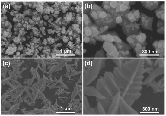 SEM images of the obtained Pd–Pt bimetallic catalysts modified by the PSWP with a frequency of 50 Hz for 1 h (a) and 2 h (c) in a solution of 0.1 mM H2PtCl6 + 1 M H2SO4. (b,d) are the high-magnification SEM images of the corresponding Pd–Pt bimetallic catalysts.