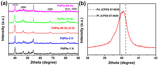 Figure 3 displays the XRD spectra of the Pd–Pt catalysts. All the catalysts showed the distinct characteristic diffraction peaks at about 40.1°, 46.6°, 67.9°, 81.7°, and 86.7°, which corresponded to the (111), (200), (220), (311), and (222) lattice planes of the Pd–Pt bimetallic catalysts, respectively (Figure 3a) [38]. This indicated that the obtained Pd–Pt bimetallic catalysts possessed a polycrystalline structure. Figure 3b shows the enlarged (111) peaks of the Pd–Pt bimetallic catalysts with a dendritic morphology. It was found that the (111) peak of the Pd–Pt bimetallic catalysts with a dendritic morphology shifted to the position between the (111) peaks of monometallic Pt (JCPDS 87–0640) and Pd (JCPDS 87–0638). This phenomenon was attributed to the substitution of Pd atoms with Pt in the lattice, which resulted in the expansion of the face-centered cubic lattice [38], indicating the successful formation of Pd–Pt alloy.