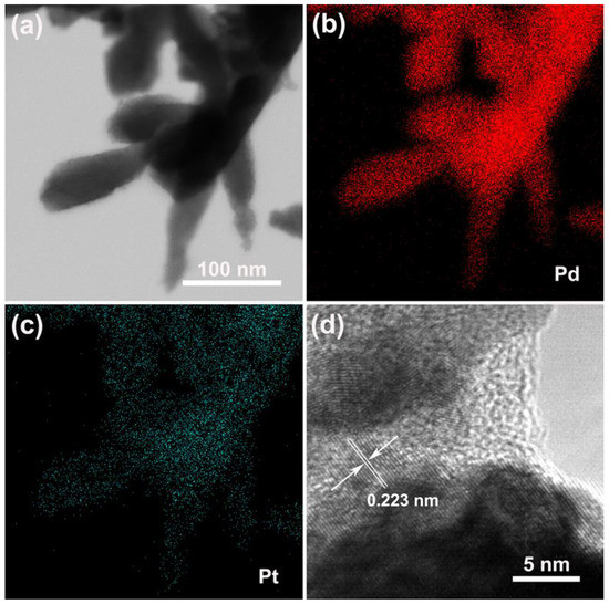 To obtain the detailed structural information of the Pd–Pt bimetallic catalysts with a dendritic morphology, the TEM analysis was conducted. Figure 4a displays the TEM images of the obtained Pd–Pt bimetallic catalysts with a dendritic morphology. It was observed that the long nanothorns grew on the tip of the Pd–Pt dendrites. The length of the nanothorns was about 100 nm. This is coincident with the observed SEM results (Figure 1e,f). Figure 4b,c shows the elemental mapping images of the corresponding Pd–Pt dendrites. The Pd–Pt dendries were composed of Pd (Figure 4b) and Pt (Figure 4c) elements, and these elements were uniformly distributed on the surface of Pd–Pt dendrites. Figure 4d shows the high-resolution TEM (HRTEM) image of the Pd–Pt dendrites. The well-defined lattice fringes of the Pd–Pt dendrites were observed, indicating the high crystallinity of the Pd–Pt dendrites. The interplanar spacing of the Pd–Pt dendrites was 0.223 nm, which matched with the (111) facet of the Pd–Pt phase (confirmed by XRD; Figure 3) [6].