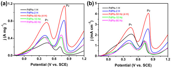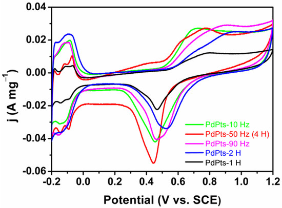 Figure 5 shows the CV profiles of the Pd–Pt bimetallic catalysts tested in a N2-saturated 0.5 M H2SO4 solution. All the CV curves displayed the similar voltammetric features to Pd–Pt polycrystalline. These CV curves exhibited three typical potential regions including the hydrogen adsorption/desorption (–0.20 V to 0.04 V (vs. SCE)), the electric double layer (0.04 V to 0.50 V (vs. SCE)), and the formation/reduction of Pt/Pd oxides (0.50 V to 1.20 V (vs. SCE)) [39]. The multiple peaks of the hydrogen adsorption/desorption of the Pd–Pt bimetallic catalysts indicated that the Pd–Pt bimetallic catalysts possessed a well-developed polycrystalline structure [40,41], which coincided with the XRD results. The electrochemically active surface area (ECSA) can be estimated by integrating a columbic charge associated with reduction peaks of Pd/Pt oxides at about 0.47 V after electric double layer correction, assuming that the charge required for the reduction of the Pd/Pt oxides monolayer was 424 µC cm−2 [42]. The calculated ECSAs of PdPts–10 Hz, PdPts–50 Hz (4 H), PdPts–90 Hz, PdPts–1 H, and PdPts–2 H were 34.43 m2 g−1, 28.30 m2 g−1, 33.96 m2 g−1, 14.15 m2 g−1, and 31.60 m2 g−1, respectively. The relatively small specific ECSA of the Pt−Pd bimetallic catalysts with a dendritic morphology can be ascribed to the large dendrite size. This is consistent with the observed SEM results (Figure 1).