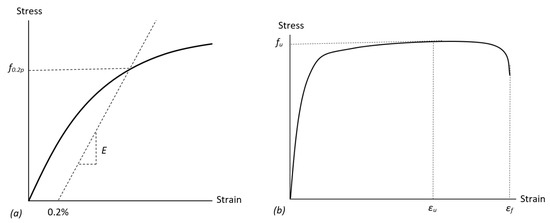 There are no specific requirements for the manufacturing processes of stainless steel rebars, but BS 6744-10:2016 [4] provides requirements for the chemical composition and also the testing methods for stainless steel bars used for the reinforcement of concrete. In accordance with this standard, the minimum required mechanical property values of stainless steel rebar are based on the carbon steel B500B specifications as given in Part 7 of BS 4449:2005 [5]. BS 6744-11:2016 [4] also states that the stainless steel rebar is required to have a minimum total strain at failure εf of at least 14%, as opposed to the 5% specified in BS 4449:2005 [5] for carbon steel. For clarity on the terms used in this paper, Figure 1 presents an idealisation of the stress–strain response for stainless steel reinforcement, indicating the key characteristics.
