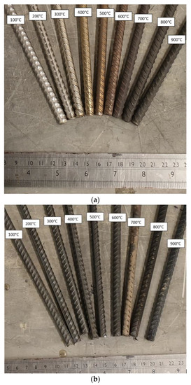 Three different cooling methods were employed in the test programme for the heated samples, including (1) quenching in cold water, (2) slow, controlled cooling in the furnace at a rate of 1 °C/min, and (3) cooling naturally in air to room temperature. Moreover, three repetitions were conducted for every grade of rebar tested per temperature point. The three cooling methods were selected to give the full range of realistic cooling rates following a fire scenario, such as the fire going out naturally or the structure being subjected to water by the fire brigade, and to establish if this is an influential factor on the residual properties. It is noteworthy that in the current paper, the phrase “residual” when employed with a mechanical property refers to the remaining value of that property following exposure to fire and then subsequent cooling. Figure 2 shows the surface state of (a) grade 1.4301 stainless steel rebars following exposure to various levels of elevated temperatures and subsequent cooling by quenching the bars in cold water, as well as (b) the corresponding images for the carbon steel rebars. It is clear that there were increasing levels of surface discoloration following exposure to higher temperatures.