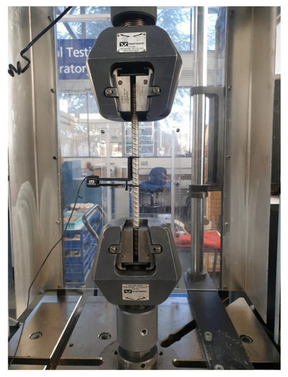 The ambient temperature tensile testing was conducted using an Instron 5584 electromechanical testing frame with a load capacity of 150 kN. The strain measurements were recorded using an Instron EX2620-601 extensometer as shown in Figure 3, which recorded up to around 10% total strain. Higher strains were measured by the testing machine, and these values were corroborated using the extensometer data. In addition, in order to obtain a direct and reliable measurement after cooling of the ultimate mechanical strain, the rebars were marked clearly at 10-mm intervals before testing, and then the final strain post testing was determined by carefully placing the bars back together and measuring the total length between the adjacent markings at the location of the break. The tensile tests were conducted in accordance with the guidance given in BS EN ISO 6892-1:2016 [8], and the samples had a total length (Lt) of 300 mm, a gauge length (Lo) of 50 mm, and a parallel length (Lc) between the gripping jaws of 200 mm. A 10-kN preload was first applied to each specimen at a rate of 0.05 mm/min. Then, an initial strain rate of 0.00007 s−1 was applied until a strain value of 1% was reached, followed by increasing the strain rate to 0.00025 s−1 over 5 min. This strain rate was maintained until fracturing of the rebar occurred.