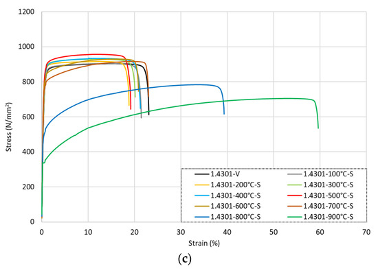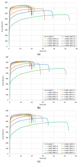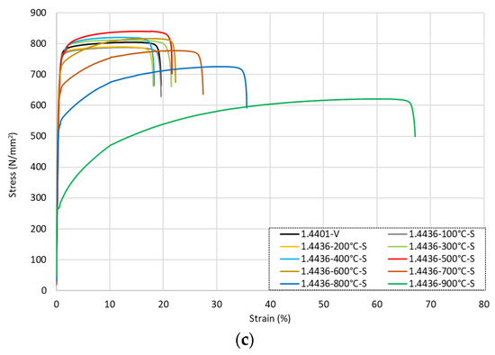 The full stress–strain responses from all grade 1.4436 samples are presented in Figure 8 for (a) the bars quenched in water, (b) the air-cooled samples, and (c) the slow-cooled specimens. It is noted that following exposure to low-to-moderate temperature conditions up to 500 °C, there was a steady rise in the tensile strengths of the samples. There was a relatively slow increase in f0.2p of between 1 and 5% per 100 °C increment and accumulating to an increase of approximately 11% after heating to 500 °C. The total strength fu followed a similar trend and increased by around 5% following heating to 500 °C compared with the virgin samples. In this same temperature range (samples that were heated up to 500 °C), εu had a negligible change following heat exposure regardless of the cooling method, whilst εf increased by around 19%. When comparing the numerical data presented in Table 5 with the stress–strain responses given in Figure 8, it is evident that this variation in strain was not owing to a change in shape of the response as this remained the same, meaning that the material did not undergo any major transformations in grain or phase in this range.