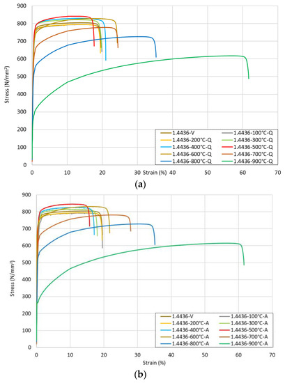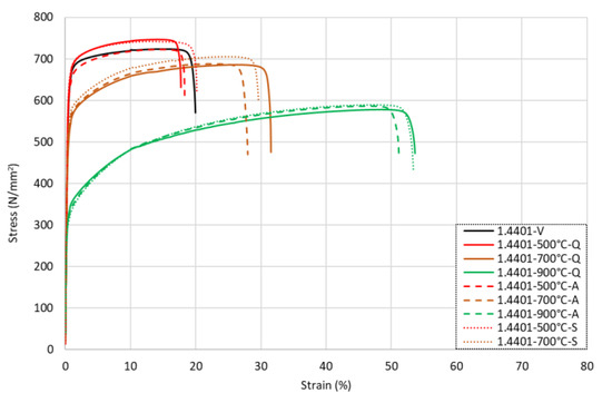 A total of 120 tensile tests were conducted on samples that were heated to a defined target temperature of between 100 and 900 °C and then subsequently cooled by one of the three methods previously described. A total of three repeats were conducted on each scenario. and the average results are presented. It is noteworthy that very little variation was observed in the results between the repeat samples. The results are presented alongside the graphical data in Table 3, Table 4 and Table 5 for the austenitic stainless steel samples and Table 6 for the carbon steel rebars. A reference system was adopted to label each specimen as follows: the first parameter denotes the material grade (either 1.4301, 1.4401, or 1.4436 for stainless steel and B500B for carbon steel), next is the target elevated temperature, whilst the final parameter describes the cooling method used, where Q is for quenched in water, A is for air cooling, and S is for slow cooling. The measured data from the tests included the 0.2% proof strength f0.2p, the tensile strength fu, the percentage total elongation at the maximum force εu, the total strain at failure εf, and the modulus of elasticity E. Each of the grades examined are discussed in more detail in the following subsections.