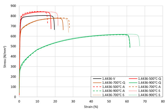 The influence of the three cooling methods for the grade 1.4436 rebars that were exposed to temperatures of 500 °C, 700 °C, and 900 °C is presented in Figure 9 together with the data for the virgin specimen. As for the other austenitic stainless steel grades discussed before, there were relatively minor differences in the residual response for grade 1.4436 to the different cooling methods. The samples heated to 500 °C showed the greatest variance from the various cooling methods, with the total strain εf showing a drop of 19% with the air-cooled sample and an increase of 10% with the slow-cooled sample.