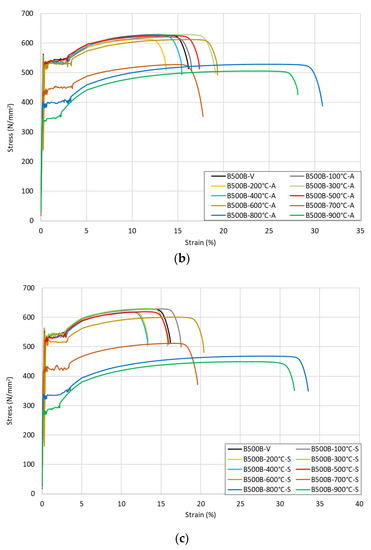 Stress–strain responses for B500B carbon steel rebars following exposure to elevated temperatures and then being (a) quenched in water, (b) cooled naturally in air, and (c) slow-cooled in the furnace.