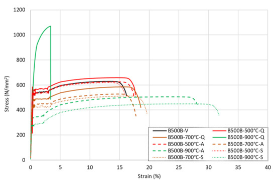 Stress–strain response for grade B500B carbon steel rebars following exposure to 500 °C, 700 °C, and 900 °C, followed by cooling.