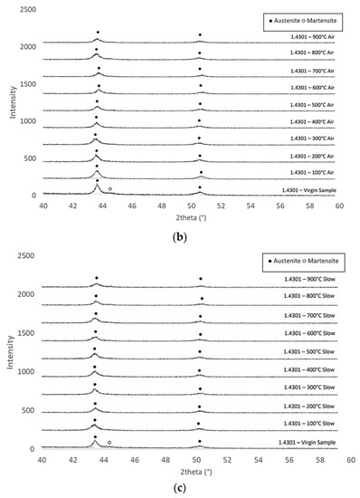 The diffractograms for the grade 1.4301 samples are shown in Figure 12 for the bars that were (a) quenched in water, (b) air-cooled, and (c) slow-cooled. Each diffractogram is compared against the unheated virgin sample. For the virgin sample, there was a small presence of martensite immediately after the austenite peak at 43.8°, and this was a relatively minor phase identified by the steady decline following the first peak, as opposed to the sharper and more uniform decline found at higher temperatures. It is noteworthy that martensite makes the material stronger and harder compared with alloys without martensite. With reference to Figure 12a, this same pattern, as demonstrated for the virgin sample, was replicated for the sample that was exposed to 100 °C before quenching in water, as there was a small presence of martensite after the initial austenite phase between 43.5 and 44°. For the rest of the quenched samples which were heated to 200 °C and above, as well as all of the samples that were air-cooled or slow-cooled as shown in Figure 12b,c, there was no martensite phase visible in the diffractograms, and there was a relatively smooth decline in terms of intensity visible from the first austenite peak.