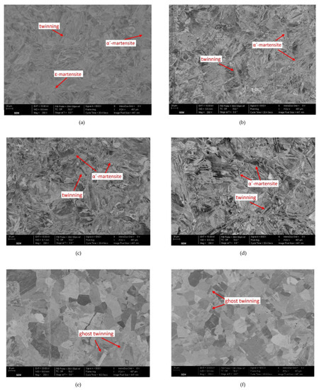 For the grain inspection, the complete microscopic imagery for grade 1.4301 is presented in Figure 13. From a visual inspection, the size, shape, and dispersion of the grain samples, as well as a change in the strengthening mechanisms, were readily observed for (a) the virgin sample, (b–d) the samples heated to 500 °C and then cooled, and (e,f) those that were heated to 900 °C before cooling. The virgin sample shown in Figure 13a had the strengthening mechanisms produced through the cold-working labelled on this image (i.e., α´-martensite, ε-martensite, and twinning). Following exposure to 500 °C and subsequent cooling by all three cooling methods, the strengthening mechanisms became more defined, as shown in Figure 13b–d. This explains the 13–15% rise in f0.2p and 4–5% rise in fu that were presented and discussed earlier in this paper for the specimens that were heated in this temperature range.