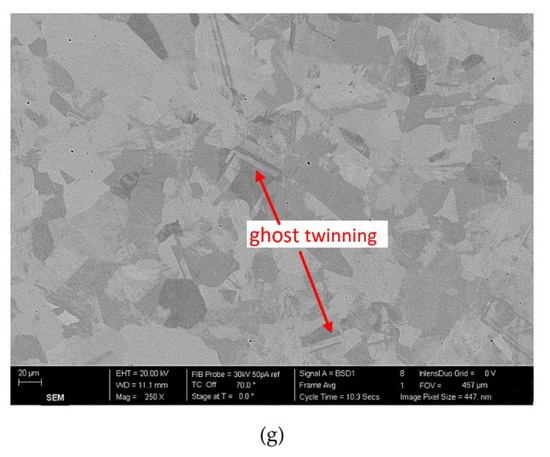 Theoretically, once the stainless steel is exposed to temperatures exceeding 727 °C, the strengthened alloy begins to actively revert to γ-austenite through the formation of new γ-austenite grains within the grain boundaries of the α′-martensite grains, and following exposure to 900 °C, a complete transformation to γ-austenite is achieved, with some ghost twinning remaining visible. This is presented in Figure 13e–g, where for the samples that were exposed to temperatures of 900 °C before cooling (by any cooling method), the grains reverted to an absolute γ-austenite alloy.