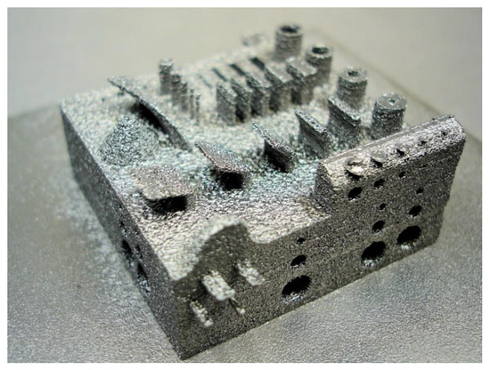 Pure water atomized iron powder was recycled up to five times. Sieving with a 400 µm mesh did not remove a significant amount of material. This implies that jet blasting was sufficient to break up agglomerated particles. Based on visual evaluation of the uniformity of raked layers and the absence of process instabilities such as smoke events, the processability of the recycled powder was found identical to virgin powder. Furthermore, first attempts were made to fabricate geometrically complex parts, as shown in Figure 3. Overall, the part surface is characterized by high roughness. In the geometry test, several design elements such as holes, thin walls, cylinders, and unsupported overhangs were successfully realized. The minimum dimensions built were 0.8 mm thickness for vertical walls, 0.7 mm thickness for horizontal walls without support, 0.7 mm diameter for vertical cylinders, 0.8 mm diameter for horizontal cylinders, and 0.7 mm wall thickness for the hollow cylinder. Horizontal holes with diameters ranging from 1 mm to 4 mm were realized. At 4 mm diameter, some deviation from circularity called sagging was observed. It proved very difficult to remove surplus powder from holes and slots of 1 mm dimension or below.
