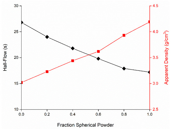 Mainly due to the reduced flowability, the processability of the water atomized powder is inferior to gas atomized material. By blending the irregular shape with spherical powder, the processability can be improved. Figure 4 demonstrates the possible extend of increase in flowability and apparent density. The other end was given by the pure spherical powder with a Hall flow rate of 17.2 s and apparent density of 4.19 g/cm3. The properties of mixtures vary nearly linearly with composition.