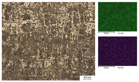 EDX measurements confirm the expected presence of the main alloying elements; 2.1 wt.% Cr and 1.6 wt.% Ni were detected for the sample in Figure 5. Furthermore, element mappings demonstrate the homogenous spatial distribution of Cr and Ni.
